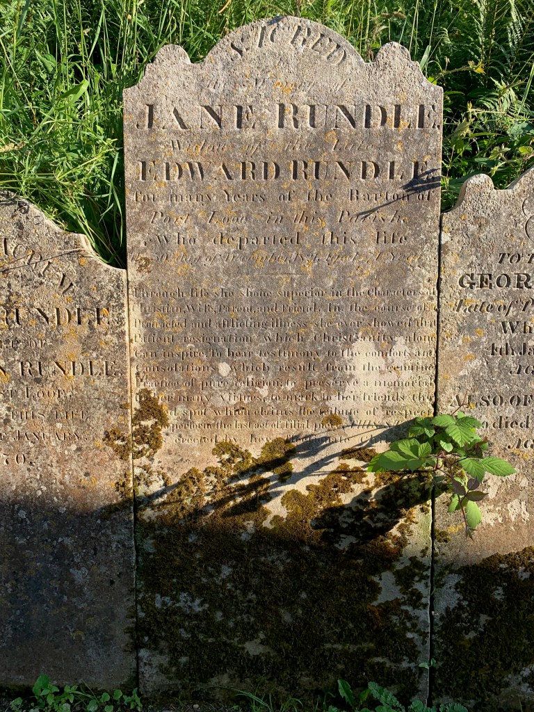 Inside Talland church, Ledger Stone 31 records the sons of Jane Rundle – Thomas Prynn Rundle & John Rundle, who both died as young boys. Jane married Edward Rundle (1750-1821) on 14 November 1772 in her parish, St. Newlyn East. Edward’s gravestone is by the south door of the church, Headstone 159