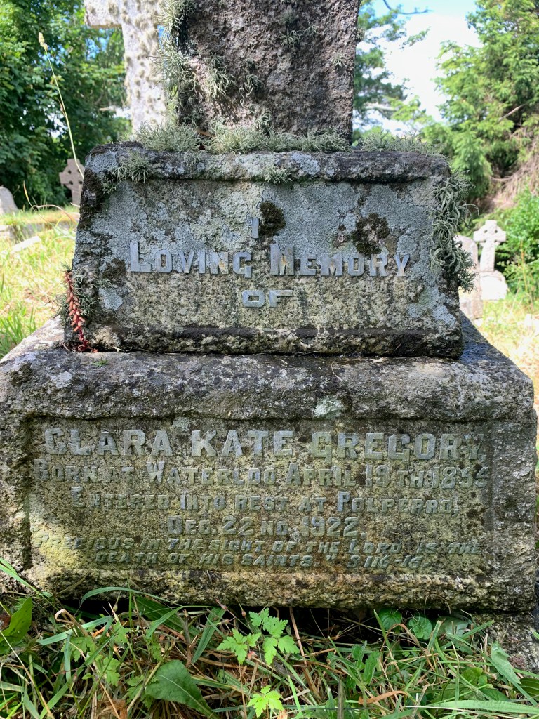 Probate records show – Clara was a spinster, living at Hillside, Polperro in 1922. Half of her effects were left to Herbert Butler, artist. Headstone 214, who’s cross is seen here in the background. Several census records show her birthplace as Waterloo, Lancashire.