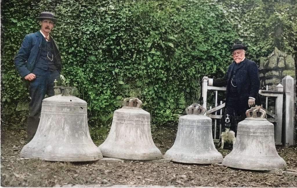 Seen here with the churchwarden, Mr William Giles, in 1913 with the ‘four old bells taken to London’. They were sent to be re-cast, travelling by rail from Looe, to the Whitechapel Bell Foundry, which was then trading as Mears & Stainbank.