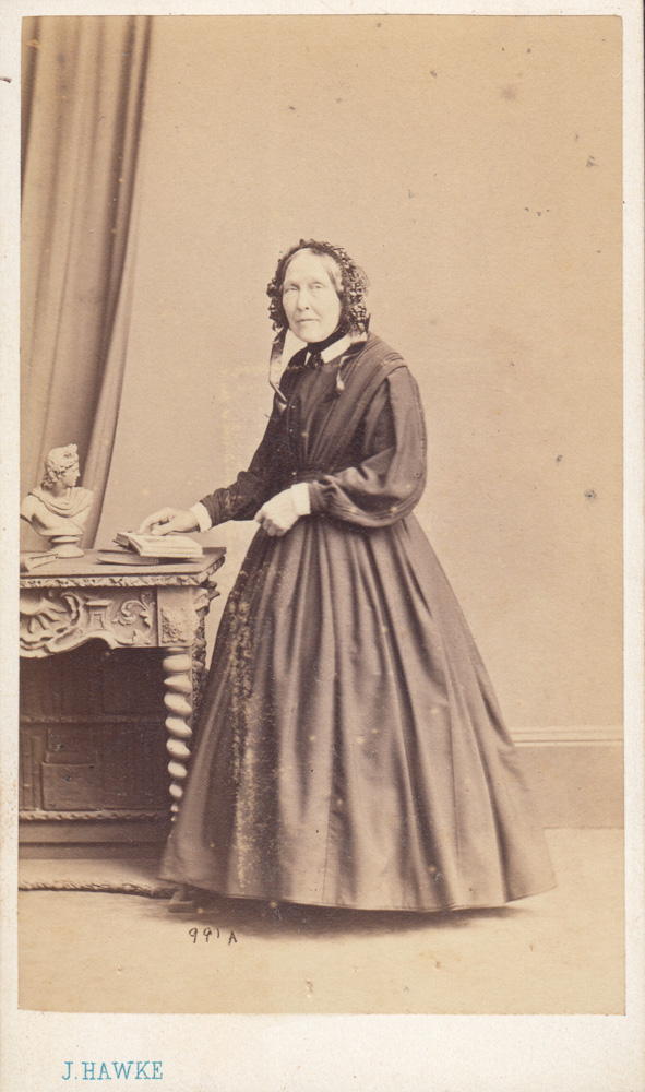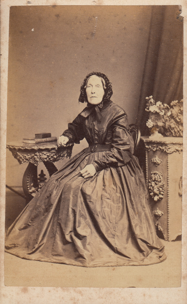 Would this be Priscilla Rendle’s 70th or 75th Birthday, (1866/1871) celebrated with a professional studio photograph? The formal dress that she wears suggests the period between 1862-1866; high neckline, full sleeves dropped below the shoulder and tight at the cuff – here shown trimmed in velvet. The bodice is pleated over the bust into a V-shaped point at the waist, with a detachable belt. The shape of the pleated skirt is defined by a lightweight cage crinoline, slightly flatter at the front, very much the silhouette of this time. Her hair is parted in the centre and smoothly tied, probably into chignons. The bow at her chin holds the face framing ruffled cap, possibly of silk.