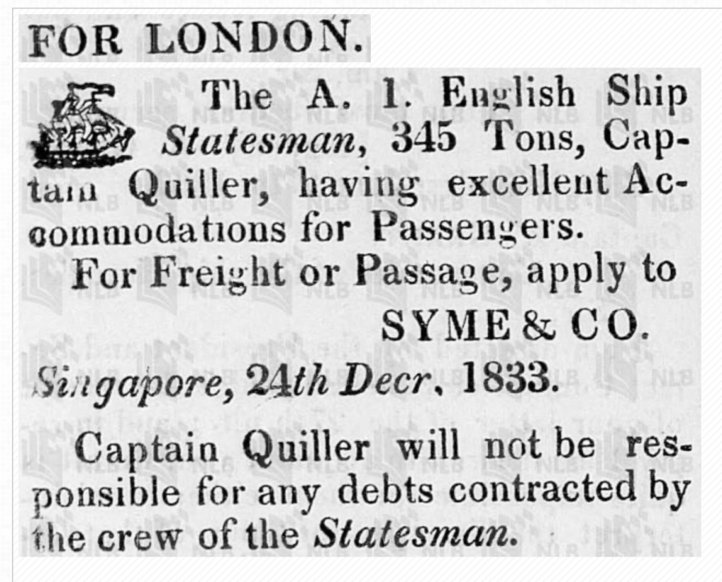 John Quiller was born in Liverpool and was a Master Mariner and Captain of the ‘Statesman’, barque, 345 tons. Documents show he would regularly carry merchandise & passengers to Port Phillip (Melbourne) & Sydney: typically