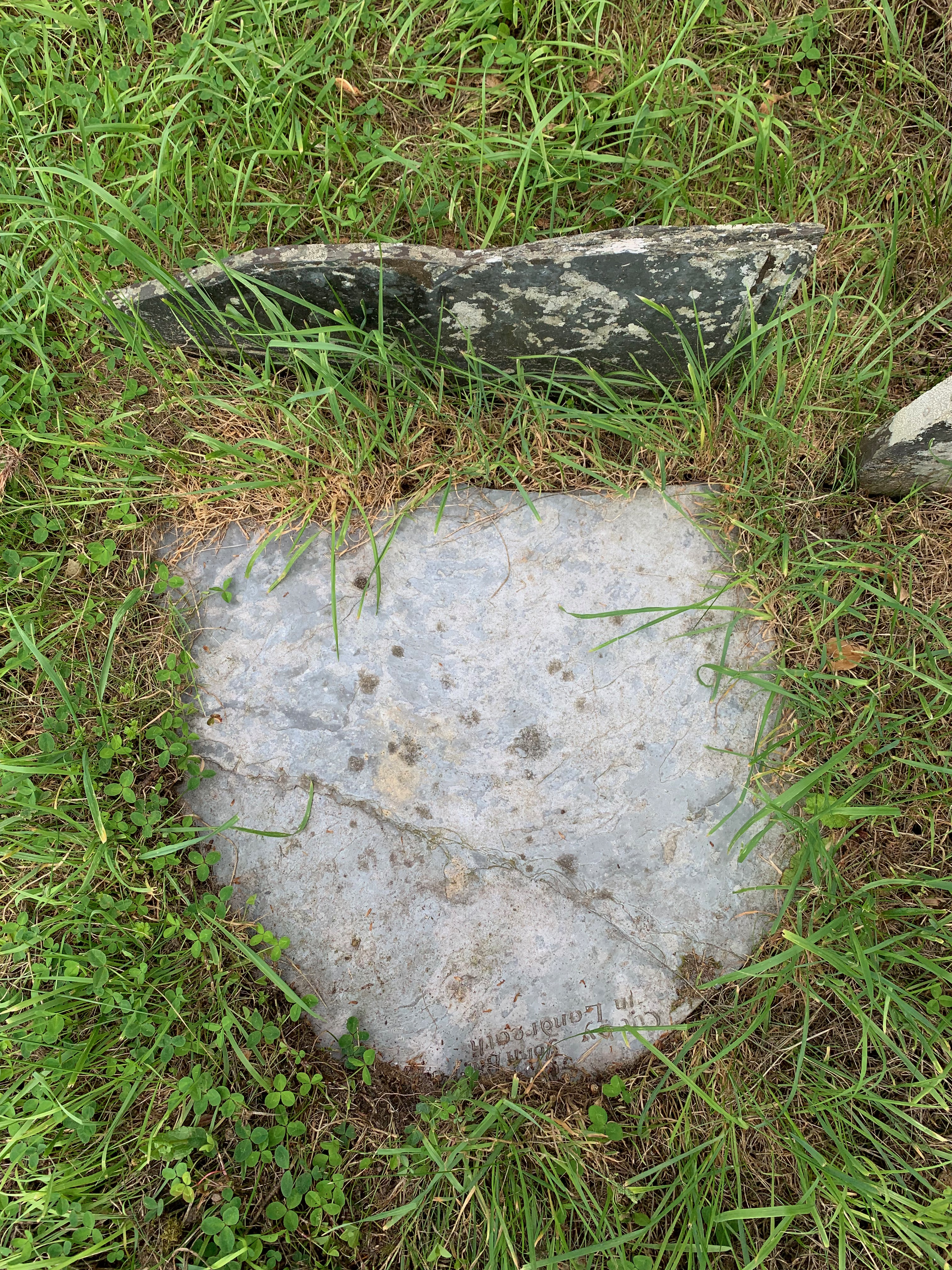 ~ Slate ~ Triangular top stone. Incised outline incorporating a semi-circular top with square shoulders. A winged angel is drawn within the arch, which lies beneath a celestial pointer, representing passage of time. A posy of flowers decorate the shoulders (one missing) and an incised heart at the base of the script.