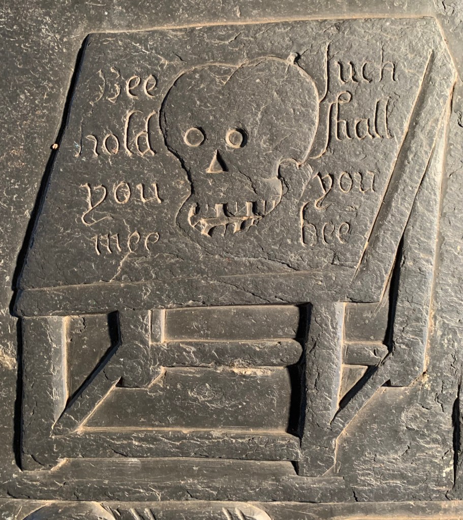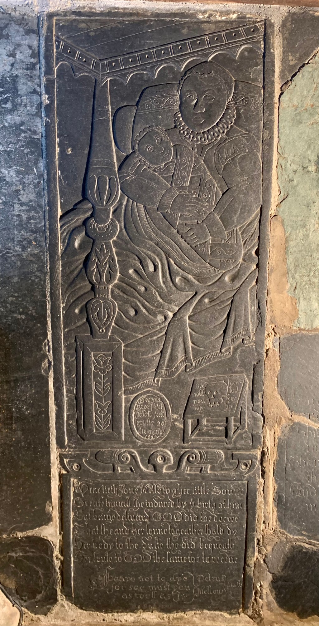 ~ Slate ~ A bas-relief and incised figure of a woman, dressed in a skull cap and small ruff. Her garment has wide padded sleeves that hang from the embellished shoulders, the sleeves are narrow at the wrist and covered by large cuffs on her gloves. The neckline indicates she is wearing a jacket or Juppe, a loose form of doublet designed to be left open. She sits in a canopied bed showing the thickness of a palliasse mattress; part of the panelled canopy is visible with an ornamental edge and one full height carved post, decorated with flowers. She is resting against a bolster and embroidered pillow and covered by a large blanket or coverlet; she embraces her baby in her arms, who is wearing a skull cap and is tightly wrapped in decorative swaddling bands. The whole illustration is displayed with a false perspective; the viewer glimpsing the occupants from the bottom left-hand corner of the bed. Below them is a foot stool inscribed with a carved skull and motto. An oval medallion is inscribed with her name and date of death. Beneath the portrait is her epitaph, in incised Elizabethan script; the top of the panel decorated with a bas-relief scrolled manuscript frieze.