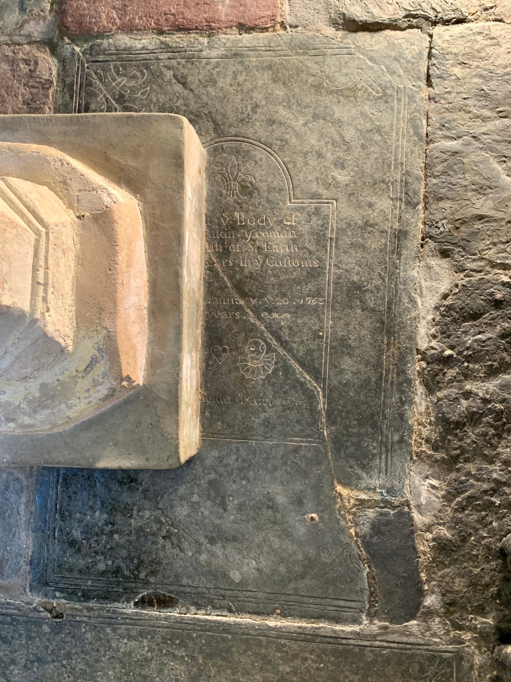 ~ Slate ~ The C15 font of Bath stone manages to obscure a large section of information and decoration on this stone, but an incised panel with a Nowy head gives us a few clues to the owners identity. There are decorative flowers to each corner, denoting life and a skull with ruff at the centre, denoting death. There is damaged to a corner and it has a large crack, splitting the stone in half.