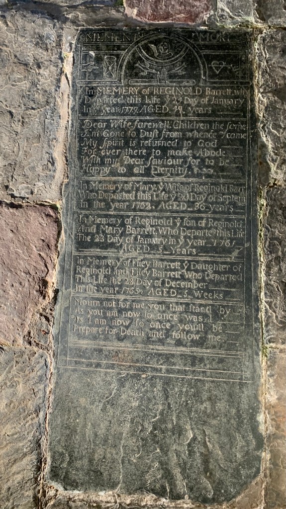 This memorial can be connected to other children’s burials inside and outside Talland Church. Wife Mary (née Toms) (1726-1762) is recorded here with their son Reginold Barrett (1756-1761). A further five children of Reginold & Phillis (née Rowet) are remembered; on this stone is Filley Barrett (1765-1765) and Reginold Barrett (1766-1769) together with William Barrett (1769-1770) on Headstone 89 in the east graveyard. A further two young children are remembered on Ledger Stone 41, Filley Barret (1771-1776) and Thomas Barrett (1774-1775).
