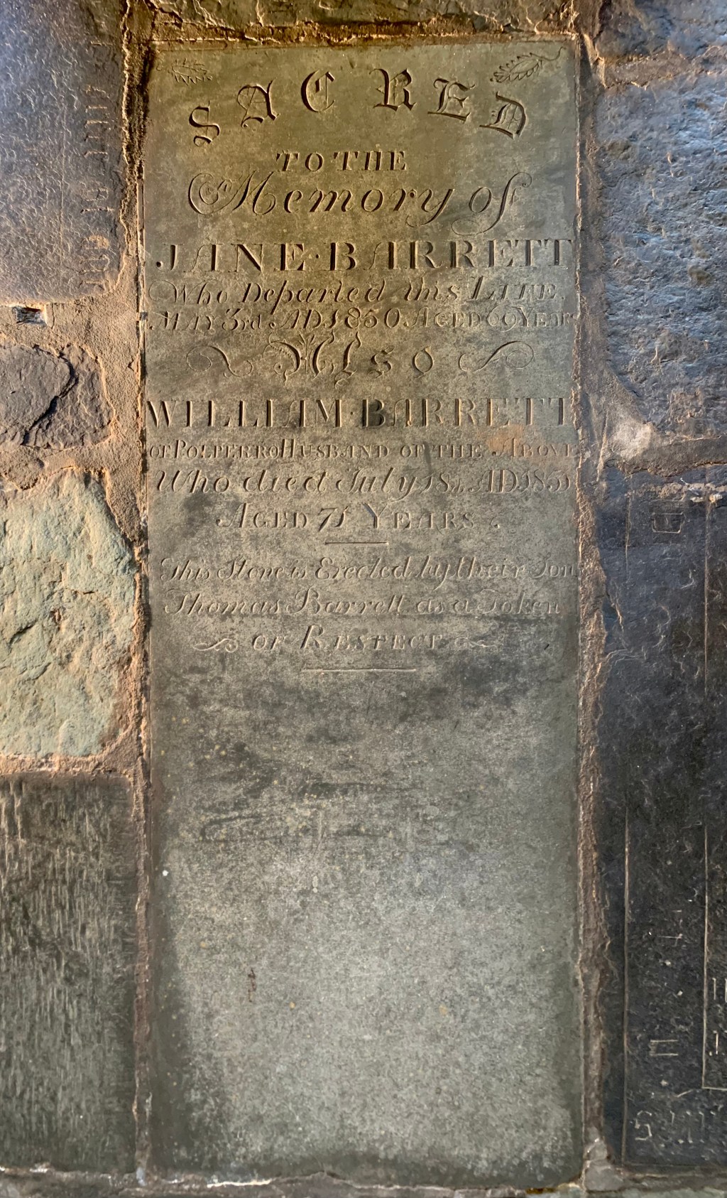 Jane Barrett (née Perry 1781-1850) was 60 years old on the 1841 census, wife of William Barrett, a Sail Maker, both were born in Lansallos. They married on 13 May 1804 at the local church. The census also includes, Philly Barrett their 9 years old daughter and their son Thomas Barrett (1820-1893), who gifted this stone. Thomas was a mariner and his tomb chest is in the higher graveyard; he married Jane Edith Johns (1822-1893) on 25 April 1843 at Talland church.