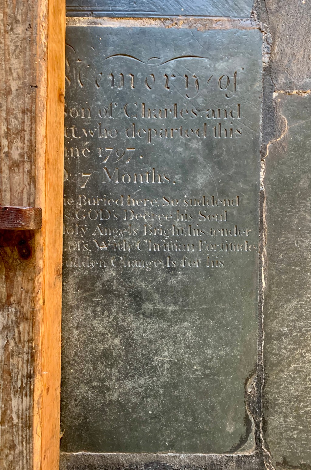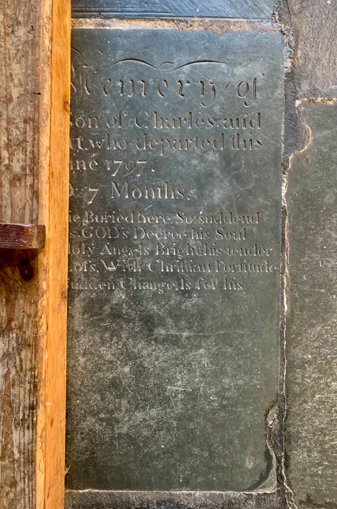 ~ Slate ~ Half of this flat top rectangular stone is hidden under the organ step; the stone is undamaged and the script is clear, with just enough visible to make a reasonable assessment to the identity of the memorial