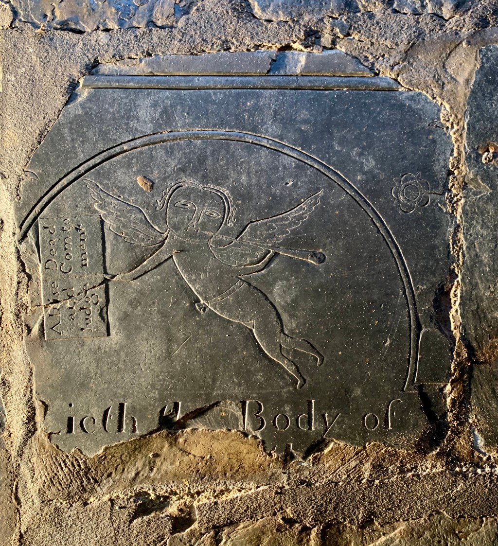 ~ Slate ~ Incised centre top decoration, on a stone fragment, showing a full length figure of a winged flying angel blowing a trumpet and holding an open book with inscription, within a incised Nowy head