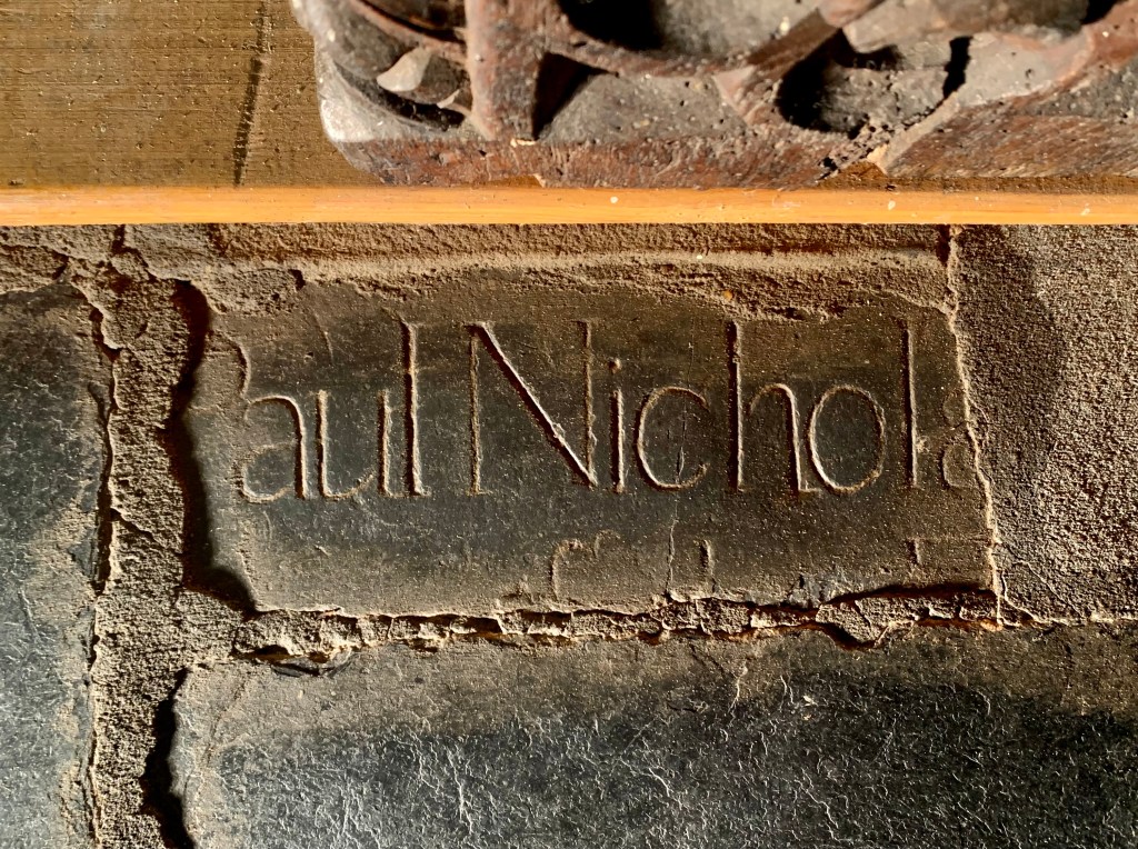~ Slate ~ Fragment showing just part of a name in an elegant slender Roman script. Details transcribed from a Will of local Alderman & Mayor of East Looe Paul Nicholas and the birth registration of his son, a Paul Harris Nicholas – has led to the following information, and consequently their immediate family tree.