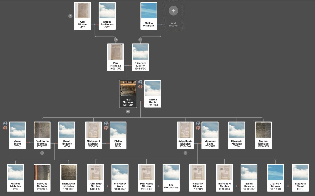 On his marriage application in 1752, and on his will, written in 1779, Paul Nicholas (1721-1787) declared himself a Felt-maker (his grand-father Abel, had been a Hatter and his father-in-law a Merchant); he became an Alderman and 1775 Mayor of East Looe. He married Martha Harris (1724-1763), daughter of Nicholas (1688-1756) & Loveday (née Cogger) (1688-1725) Harris, of East Looe, at St Martin’s Church in East Looe on 23 January 1752. Each of their three sons married three sisters. Paul Harris Nicholas (1753-1788) = Anne Blake (1760-). Nicholas Harris Nicholas (1756-1816) = Phillis Blake (1758). John Harris Nicholas (1758-1844) = Margaret Blake (1762-1852).