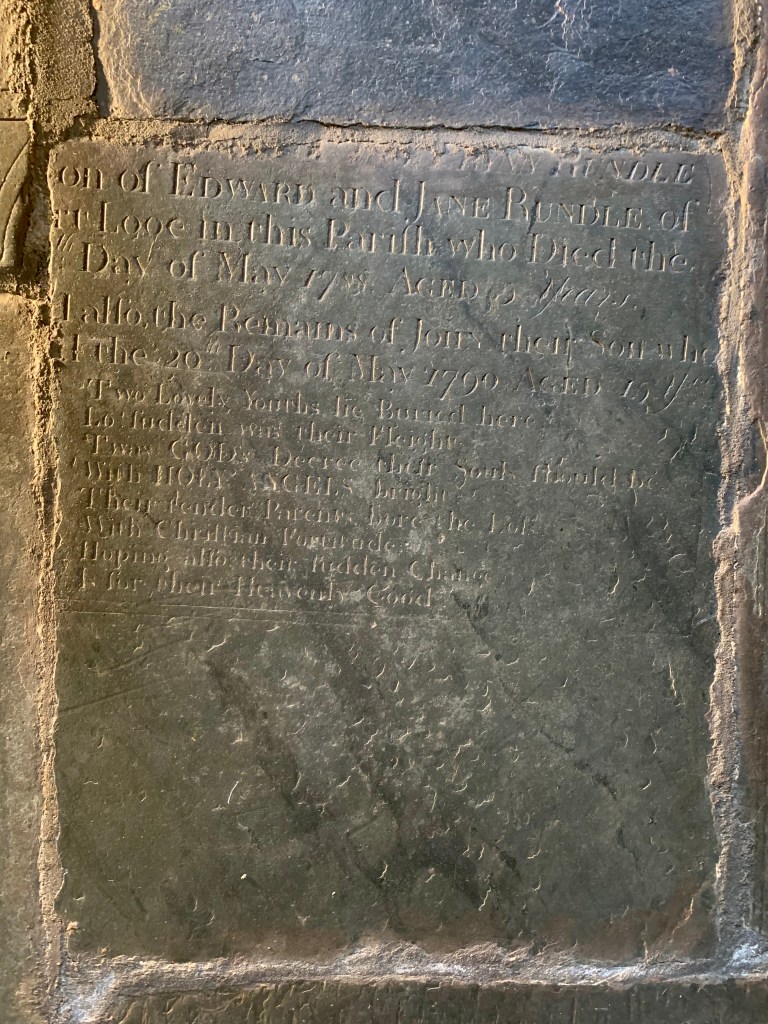 …PRYNN RUNDLE, (S)on of EDWARD and JANE RUNDLE of (Po)rt Looe in this Pariƒh who Died the … Day of May 1788. AGED 5 Years