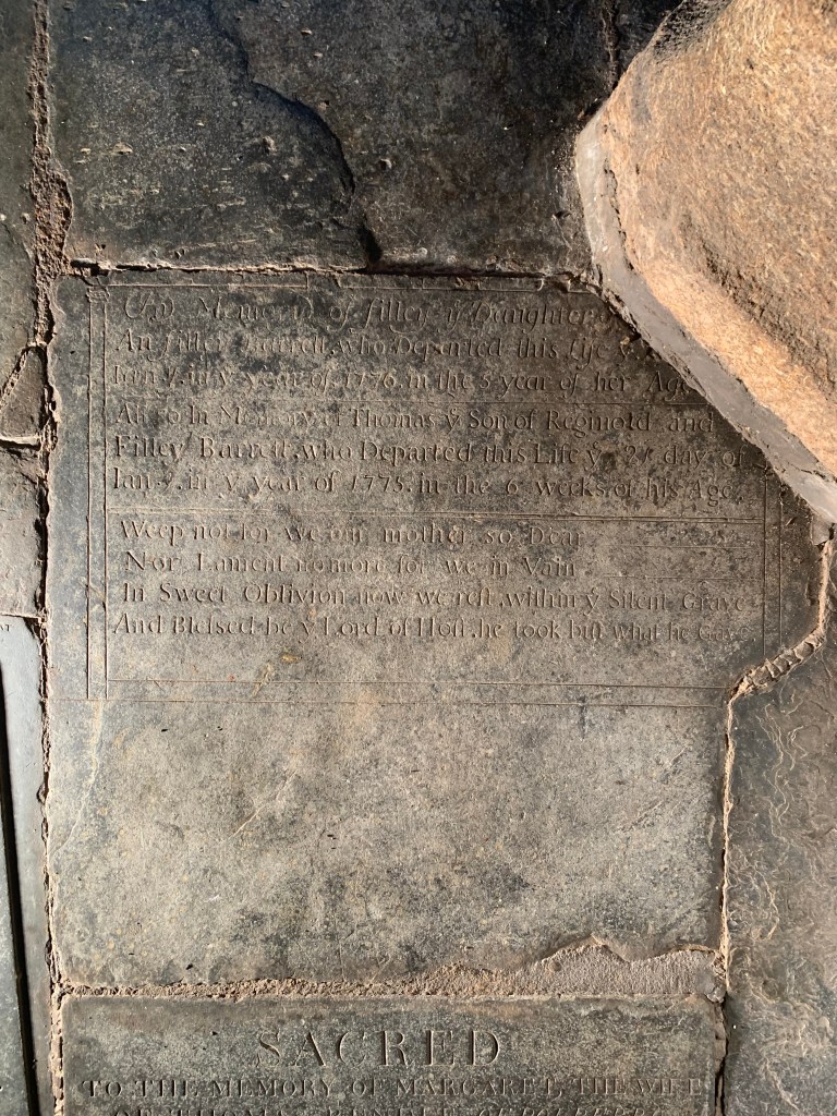 This memorial can be connected to other young children’s burials inside and outside Talland Church. The Will of Reginold Barrett (1730-1779) states he was a mariner of Talland Parish. He married Mary Toms (1726-1762) in Lansallos on 23 June 1753. Ledger Stone 15 records her death and that of their son Reginold Barrett (1756-1761). Seven months after his wife’s death, Reginold married Phillis Rowet (1741-) on 16 April 1763 at Talland Church. A further three of their children are remembered; Filley Barrett (1765-1765) Ledger Stone 15 and Reginold Barrett (1766-1769) together with William Barrett (1769-1770) on a Headstone 89 in the east graveyard. There are many different spellings for both forenames and surnames.