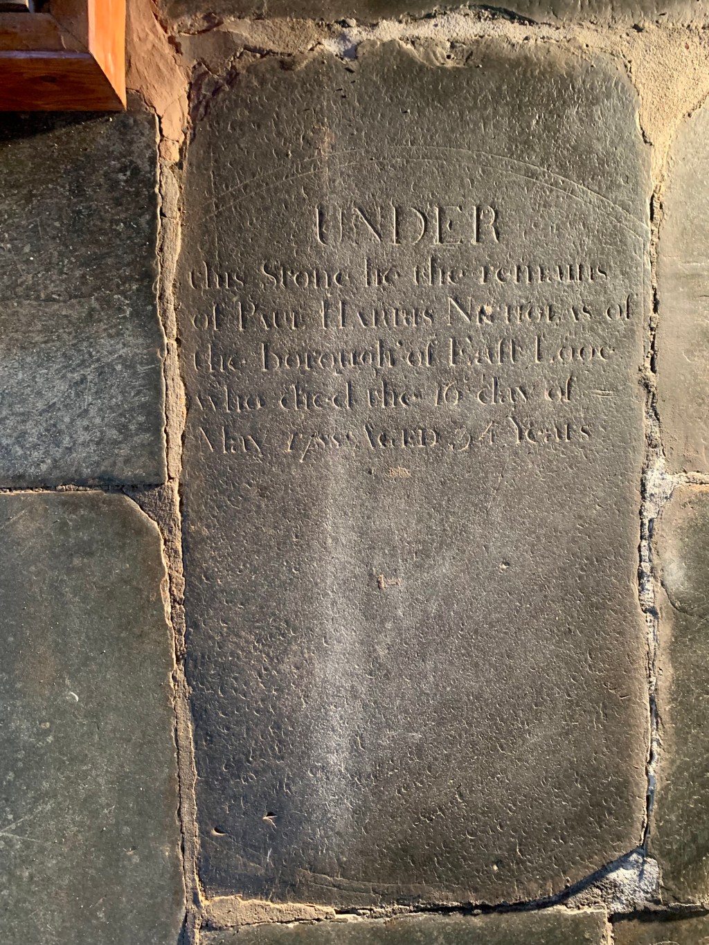 Paul Harris Nicholas (1753-1788) was the son of Paul Nicholas (1721-1787). His birth register names his father and mother and their parents, all of East Looe, and gives the date and time of his birth “born the 13th day of the 11 month called November 1753 about half after 8 o’clock in the morning” He married Sarah Kingston (-1784) in 1777; two of their three children are buried in the church – Loveday Nicholas (1778-1805) and Nicholas Harris Nicholas (1781-1806). Paul married a second time, after Sarah died, to Anne Blake (1760-) in 1786, but two years later when his children were still under 10 years old, Paul dies aged 34years. Two of Paul’s brothers married two of Ann’s sisters.