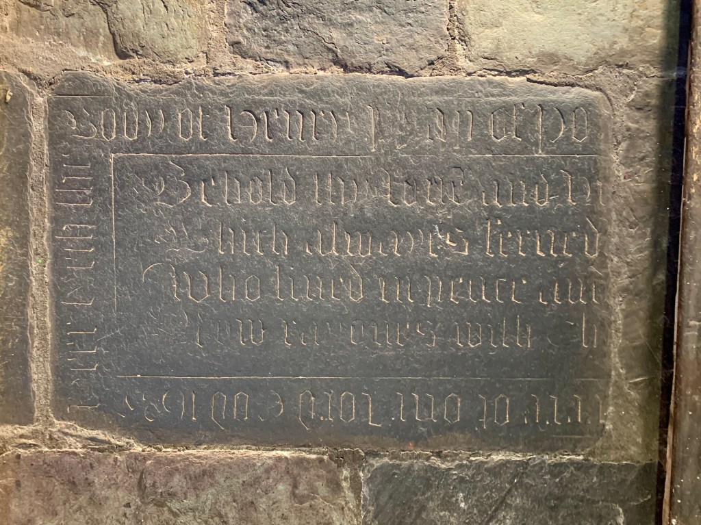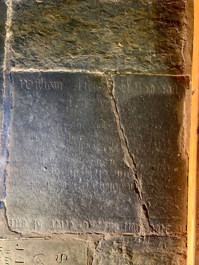Sadly not one of them is complete and of the few fragments visible not enough information is legible to identify names for absolute certain. From the inscription extracts on view, we can tell each stone would have varied in size, the borders appear to be different widths and the marginal inscriptions have incised text of varying styles, all in black letter Old English script, which is difficult to read. The earliest detectable date appears to be 1621.