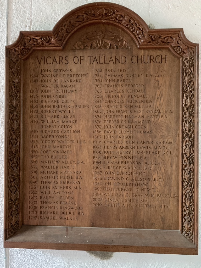 - A commemoration of all the vicars that have officiated at Talland Church, dating back to 1264.