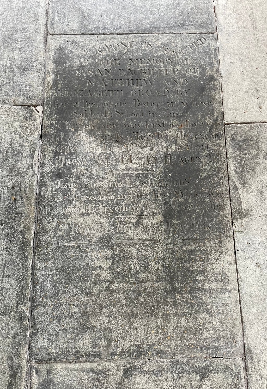 This stone is erected to the memory of Susan, daughter of Matthew and Elizabeth Broad by her affectionate Pastor in whose Sabbath school in this Church she was first a scholar and afterwards a Teacher. she exchanged time for Eternity after a short illness Sep 14th 1841. Aged 20