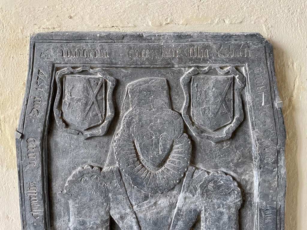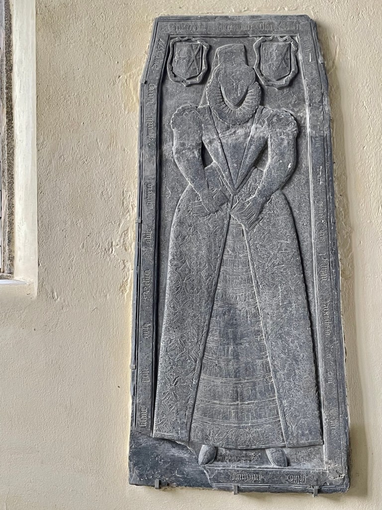 Portrayed as a mature wealthy woman Margery wears a closed ruff at her neck, a stiff bodice, farthingale and kirtle with decorated forepart, an embroidered gown and matching sleeves with cuffs, a pillar box hat and veil, and slipper shoes with soles. She carries a pair of gloves, a symbol of wealth and social standing and a small book. It’s possible to read the words etched on to the front cover: VERSUM DEI – the Latin translation: ‘Word of God‘