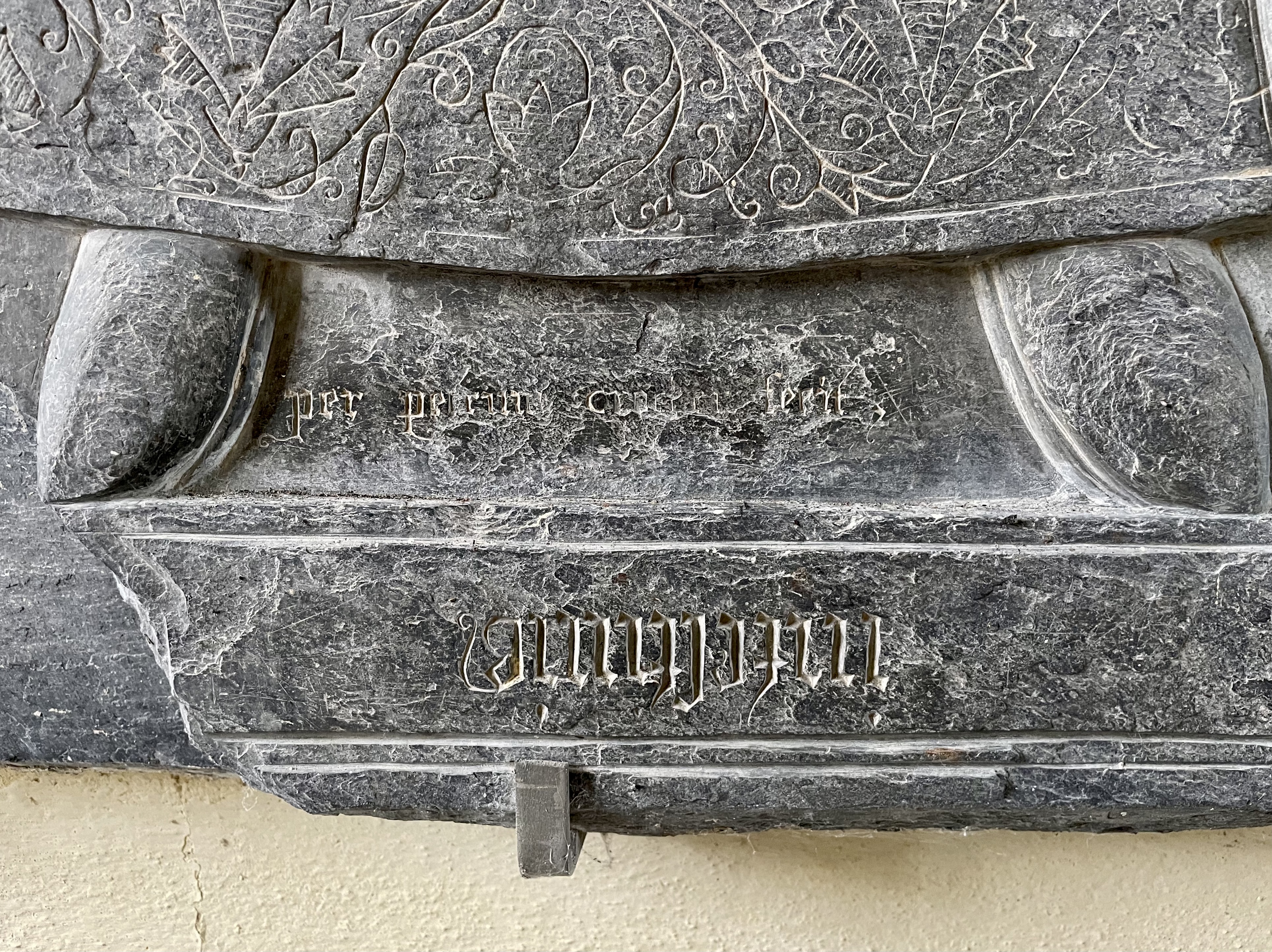 Margery was married twice; the heraldic shields illustrate the marriage pairings. Next to her own Coat of Arms for Smith: [Azure], a saltire [argent] between four martlets [or]. It is just possible to read the Budockshed arms above her left shoulder: [Sable], three lozenges in fess between as many Stags’ heads cabossed [argent] . Over her right shoulder is the clearer image of: a stag trippant. Even with this clue, the name of her first husband remains elusive.