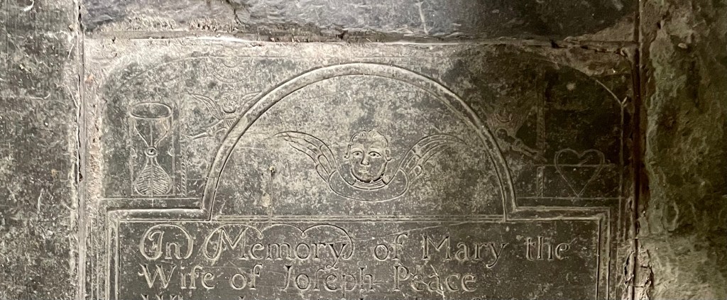 Motifs of death are incised: centrally is the winged angel's head; also winged angels with outstretched arms,