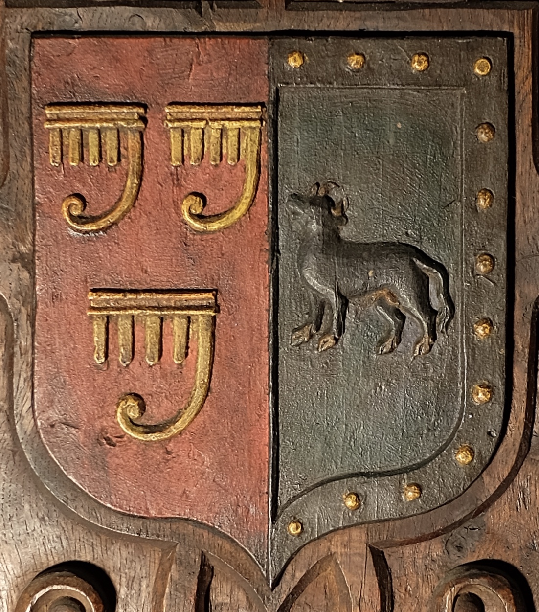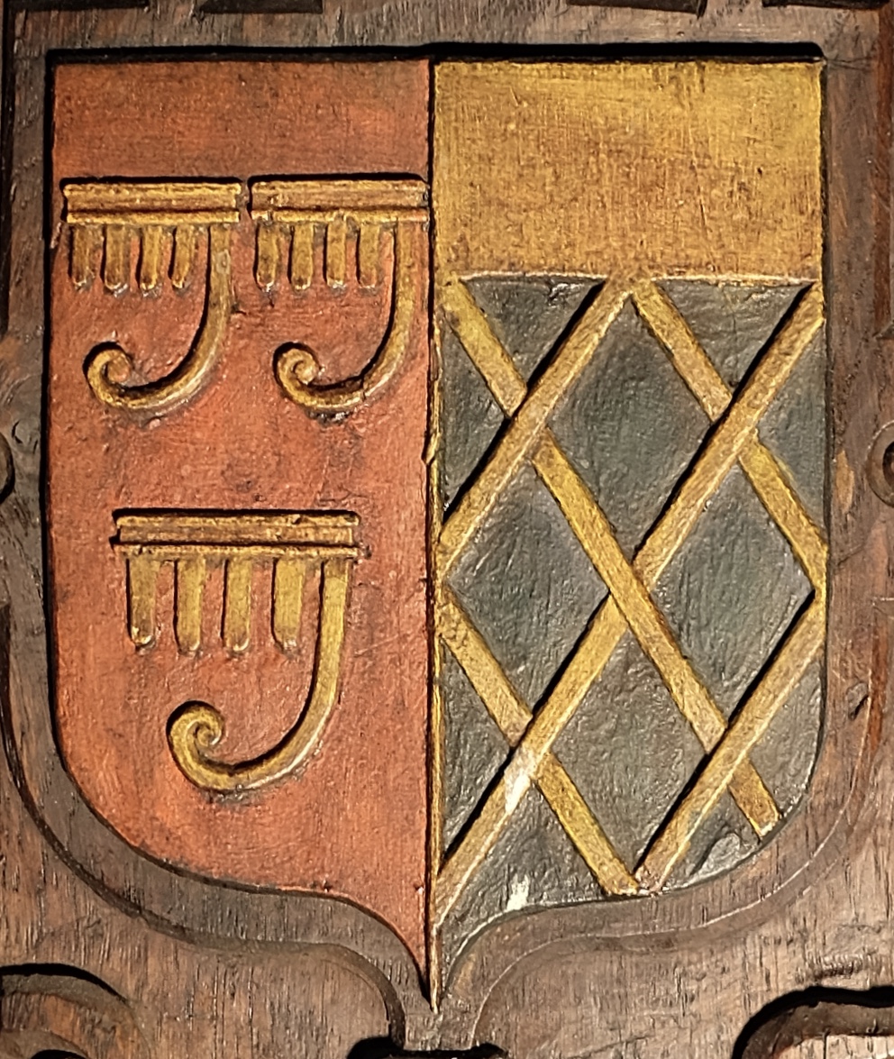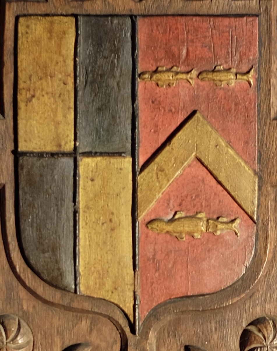 Sir Bernard Grenville, an English politician, was very keen to portray the union of the Bevill and Grenville ancestry; his decoration to the bench ends in the north chancel date from the Stuart Period. Each bench end panel is embellished with a carved and painted heraldic shield surrounded by geometric decorative strap work. The heraldry is showing the impaling (the division of a shield into two equal parts) of two family crests through marriage; each individual is named with a black hand drawn ink inscription. More complex family trees are depicted on the larger shields now decorating the choir stalls.