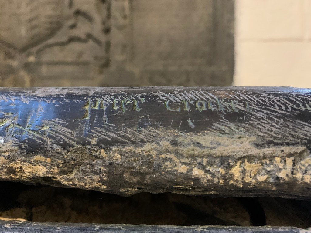 The signature of the carver, local mason, Peter Crocker is visible on the front edge of the tomb. He is know for his characteristic squat Gothic script and highly likely to have had a workshop in Looe, from 1588-92. It is regarded that the inspiration of his work, by taking the architectural features of Classical design, rather than crude woodcuts or religious symbolism, may have come from studying decorative plasterwork available in continental prints, suggesting perhaps that he was also a stone carver or plasterwork sculptor in large country houses. Other tomb work attributed to him are found at the churches of Lansallos, Pelynt, Duloe and St. Martin-by-Looe.