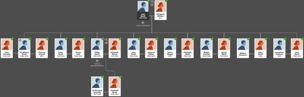 Sir Bernard Grenville (Peter Bevill’s great, great, great grandson) married Elizabeth Bevill (Peter Bevill’s great great granddaughter) and their first born son was named (Sir) Bevil Grenville (1596-1643), a mix of both the Bevill and Grenville ancestral names.