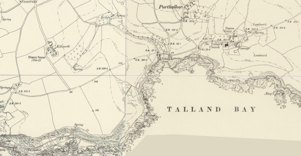 Philip Bevill married Elizabeth Berrye (1541-1622) and they had just one daughter Elizabeth Bevill (1565-1607). Cleverly Philip willed his legacy of the Killigarth estate, before her death, to her husband Sir Bernard Grenville (1567-1636). The estate included thousands of acres of arable land, meadows, heathland, woodland and mills, in more than a hundred Cornish manors spread over a wide area. Killigarth Manor in 1591 consisted of Pleaton, Sutton, Brent, Bridewell, Killigarth Mill, the Pound, Trerust, part of Polperro, Menadue, Mortha, Polkeeves, Polpucky, Trelay and Newton.