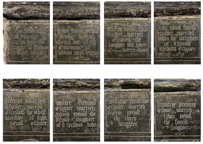 The front side panel has a heraldic achievement relating to John Bevill; the armorial charges central to the slab appear on a large incised shield, surrounded by a wreath of laurel leaves, with decorative scrolled shoulders and curved feet. Between two ornamental pilasters, the centrepiece is topped with a crest of ‘a passant griffin’ standing on a torse, and ferocious looking rampant beasts act as supporters. The armorial shows Bevill quartering Bere and impaling Milliton.