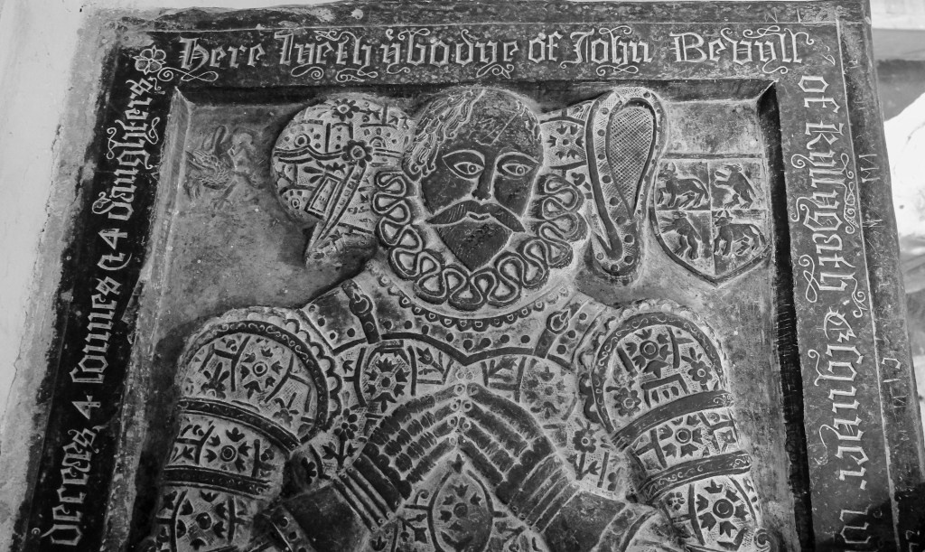 The top panel boasts a full length image of John Bevill, Esq. with a moustache and beard, in an extremely elaborately, embossed and embellished Elizabethan suit of armour. The tomb suggests a man of importance, his unimaginably expensive ornamental armour is decorated with extravagant patterns of Tudor contemporary fashion; at this time Queen Elizabeth I would gift a license to enable noblemen and knights to wear such lavish ceremonial armour.