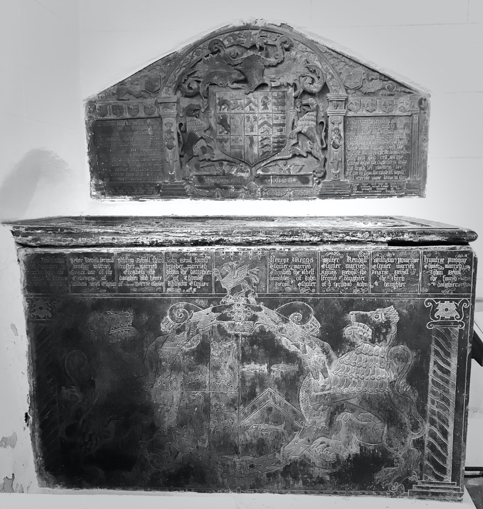 The tomb was constructed ten years after John Bevill’s death and paid for by his first son and heir, Sir William Bevill (1549-1600), a well connected country gentleman living and entertaining at Killigarth Manor; his father’s tomb would have been a great talking point, flaunting his wealth and status. William’s primary job was to help defend the Cornish coast, he was captain of the Talland Militia with six companies and a total of 670 men under his command, including; 225 with pikes, 210 with muskets, and 190 armed with light muskets, called ‘calivers’. In the year of the Spanish Armada, 1588, Elizabeth I had provided Cornwall with firearms and ammunition from her own reserves; the huge Spanish fleet sailed up the Channel, visible from Lansallos and Talland. As well as his militia work, William Bevill became the first Steward of the new Borough of West Looe, 1574, sitting at frequent court cases; Justice of the Peace of Cornwall from 1583, and High Sheriff of Cornwall in 1589 & 1598. He was Knighted in 1589, so helping to authorised the date of the tomb, however, importantly, he did not produce an heir. His first wife Jane Arundell (1542-1597) was the daughter of Thomas Arundell (1502-1552) who was convicted of conspiring to overthrow the government and was beheaded on Tower Hill. His second wife Frances Knyvet (1583-1605) was about 17years old, William 52, when they married in 1600; William died 6months later.